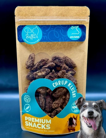 Zabawa z psem? To prostsze niż Ci się wydaje! Wystarczy mieć przy sobie ChrupKluski mięsne marki BaffiDi. To ciekawa forma przysmaku, która pomoże pogłębić więź z czworonogiem podczas zabawy. Cudownie pachnący naturalny przysmak wykonany jest z zaledwie trzech cennych składników. Delikatne suszenie ciepłym powietrzem stosowane w procesie produkcji zapewnia bezpieczeństwo pod względem epidemiologicznym, dzięki czemu nie ma konieczności użycia środków chemicznych i konserwujących. Produkt nie zawiera również wzmacniaczy smaku, sztucznych aromatów oraz wypełniaczy. Proces suszenia nadaje mu niezwykłej kruchości i chrupkości oraz pozwala zachować wszystkie wartości odżywcze. Nasze ChrupKluski mięsne marki BaffiDi zawierają 90% mięsa wołowego (łosoś), 5% oleju z łososia i 5% świeżych jaj.