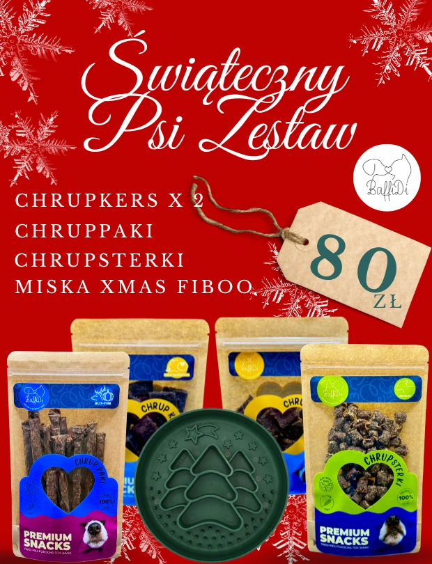 - Szukasz idealnego, świątecznego prezentu dla swojego psa? Świąteczny PsiZestaw BaffiDi to limitowana paczka pełna naturalnych przysmaków, stworzona, aby Twój czworonóg poczuł prawdziwą magię Świąt.